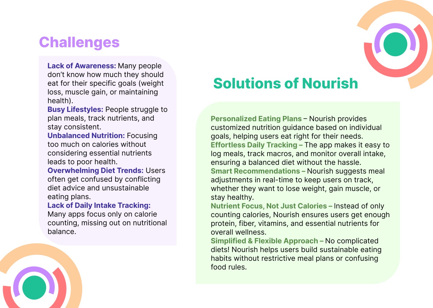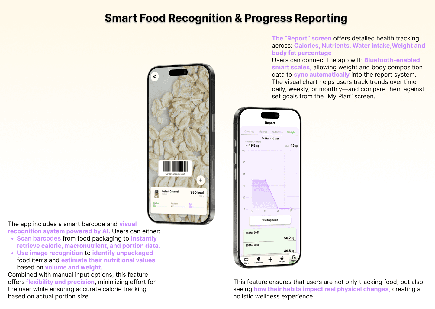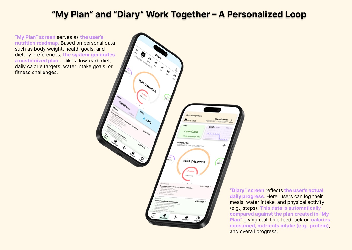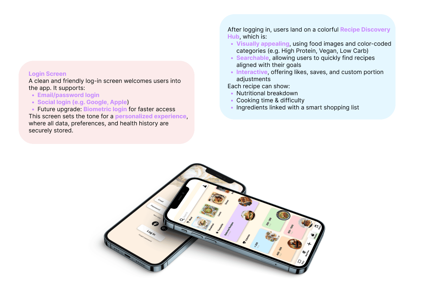 Each screen is crafted with user needs in mind — balancing aesthetic clarity and functional depth. The app not only tracks, but empowers users to understand, plan, and enjoy their nutritional journey in a connected ecosystem.